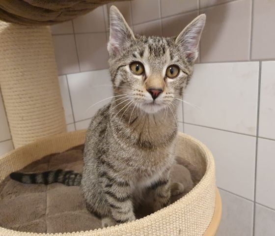 Assy ist ein lustiger kleiner Kater mit einem ernsthaften Gesichtsausdruck. Er sitzt zusammen mit zwei weiteren kleinen Katern im Katzenhaus und kommt mit beiden prima zurecht.
