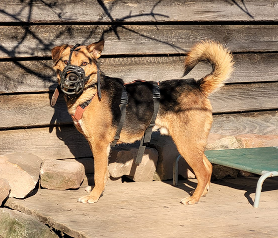 Nur ganz selten ergeben sich Gelegenheiten, in denen er mit Furcht oder Panik reagiert. Zur Sicherheit trägt er deshalb im Training noch einen Maulkorb. Seine zukünftigen Besitzer sollten dies auch in der ersten Zeit im neuen Zuhause beibehalten.