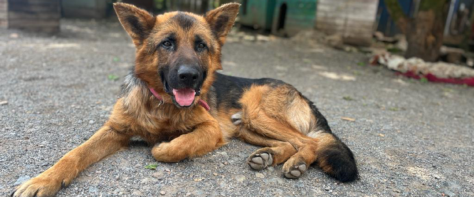 Gunna stammt aus einer Privatabgabe. Der junge Schäferhundrüde hat leider eine Futtermittelallergie, daher ist sein Fell noch sehr stumpf, durch die Umstellung des Futters wird es aber täglich besser. Zurzeit ist er noch viel zu dünn.