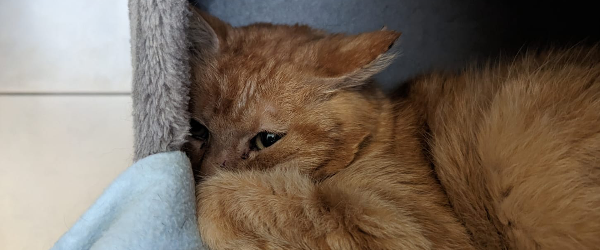 Otto wurde gefunden und ist leider, wie man auf den Bildern sieht, das totale Gegenteil seines Zimmergenossen Karel. Auch wenn er mit seinem leuchtend roten Fell sehr gut aussieht, er ist sehr schüchtern und introvertiert. Gestreichelt werden findet er gar nicht schlecht, hält man das eine Weile durch, entspannt er sich auch sichtlich. Trotzdem findet er momentan die Welt an sich und alles darin erschreckend und verhält sich mucksmäuschenstill, um nicht aufzufallen - frei nach dem Motto: ich seh euch nicht, also seht ihr mich auch nicht. Otto braucht noch etwas Hilfe, um Selbstvertrauen aufzubauen und seinen Platz in der Welt zu finden. Er ist deshalb nicht für einen quirligen Haushalt geeignet, sondern eher für ruhige und geduldige Menschen. Otto hat nichts gegen andere Katzen, könnte aber auch gerne mit Karel zusammen umziehen, die beiden ergänzen sich im Naturell sehr gut. Er ist geimpft, kastriert und sollte, wenn er die Welt nicht mehr für ganz so gefährlich hält, die Möglichkeit zum Freigang bekommen.