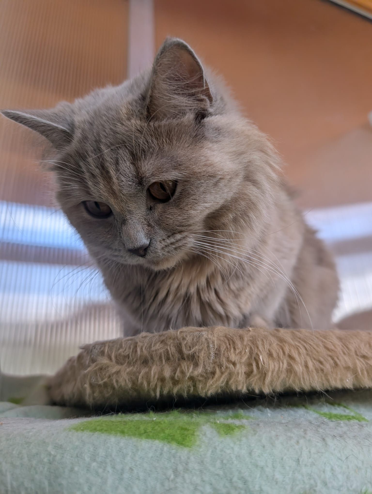 Feeli ist sehr verspielt, hört auf ihren Namen und kommuniziert mit klugem Einsatz ihres Körpers und ihrer Stimme. Feelis neue Besitzer sollten ein wenig die Körpersprache von Katzen lesen können, da gibt es bei Feeli wirklich viel zu beobachten, das macht Spaß.
