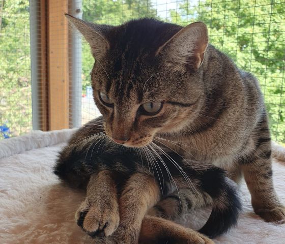 Lou und sein Bruder Tom wurden unter vielen Tränen bei TiNO abgegeben. Sie hatten ein sehr liebevolles Zuhause, das alles dafür getan hatte, dass sie bleiben konnten, aber es reichte einfach nicht aus. Lou und Tom gingen mit Vorliebe auf dem Dach der Nachbarn spazieren und machten dabei so viel Lärm, dass der Schicht arbeitende Nachbar kein Auge zubekam. Zäune und dergleichen brachten keinen Erfolg, sie fanden immer wieder einen Weg, auszubrechen. Die beiden leidenschaftlichen Freigänger einzusperren, war aber auch keine Option.