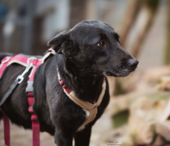 Shonda, eine schwarze Labradorähnliche, nette Hündin. Shonda lebt bei uns in der Hundegruppe und hat überhaupt kein Problem mit anderen Hunden. Anfangs fand sie das spazieren gehen unnötig mit diesem Geschirr und dieser daranhängenden Person. :-)