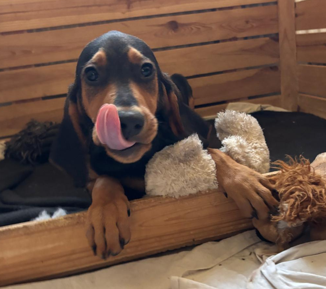 Die neun Wochen alten Tiroler-Bracken-Mischlinge sind angeimpft und wurden von einer engagierten Ehrenamtlichen mit der Flasche großgezogen, da ihre Mutter kurz nach der Geburt verstorben ist.